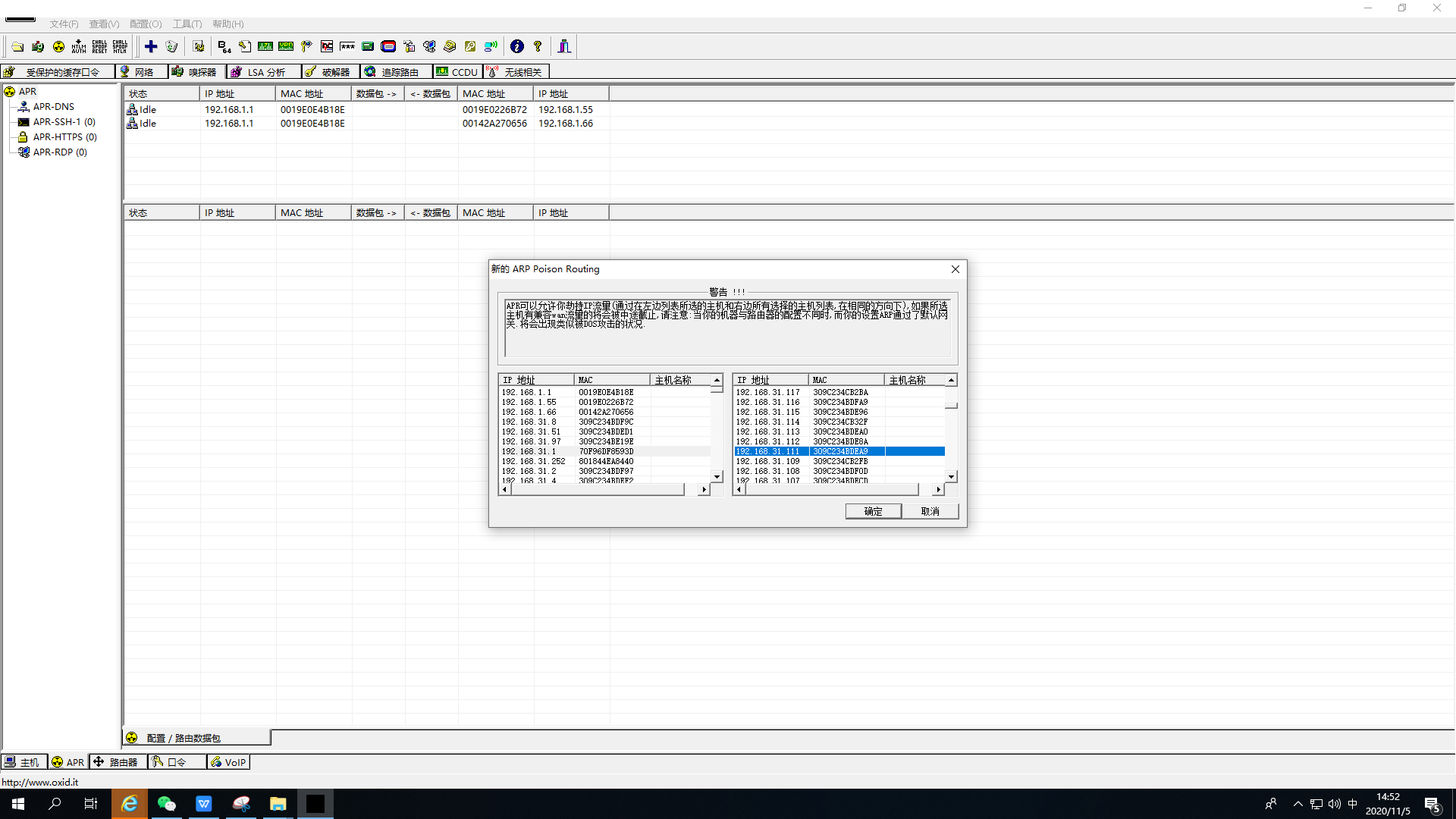 3、选中ARP页-》点下列表栏空白处,大加号变为可选-》点大加号,在弹出的窗口中选择要嗅探的目标主机(注意这里的选择和单击欺骗嗅探不一样,左面直接点网关,其它机器自动出现在右侧列表中,这时需要按住ctrl键在右侧选择你需要嗅探的主机,如图所示)