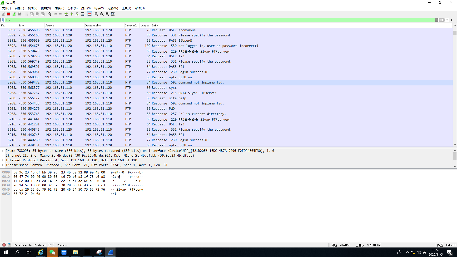3.B同学在机器中安装Wireshark,并将其打开;之后用用户名和密码登陆A同学的FTP服务器,并上传一张图片和一个压缩包。