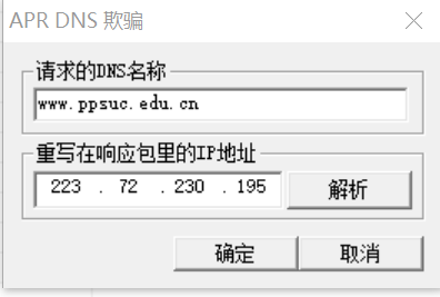 欺骗成功后,在被害机器上查看www.ppsuc.edu.cn的IP 查看是否被解析到了,指定的IP地址上。