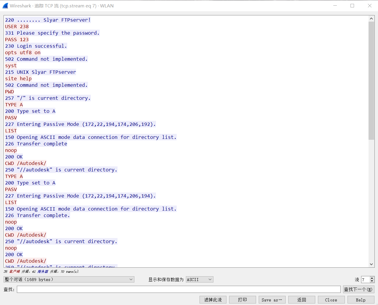 4.B同学停止Wireshark抓包,并和A同学一起分析数据包中的FTP登录过程,还原登录用户名和密码,以及上传文件。