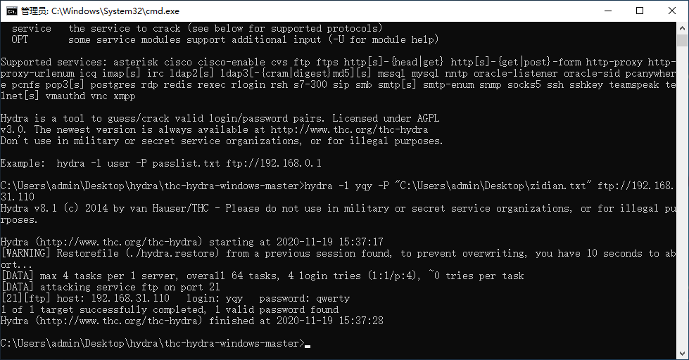 2.B同学使用hydra 对ftp用户的密码进行字典破解。hydra 中有关于该软件的使用命令语法。字典文件需要自己去生成。