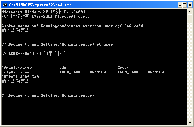 1.在windows xp系统中使用 net user cjf 666 /add添加用户cjf,密码666的账户(用户名和密码可以自己设定);并使用net user命令确定用户添加成功。