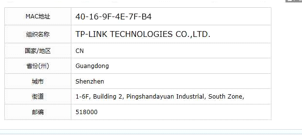 在一个案件中,获取了犯罪嫌疑人的一个MAC地址:40-16-9F-4E-7F-B4,请查询该MAC地址对应的厂商是(附截图)