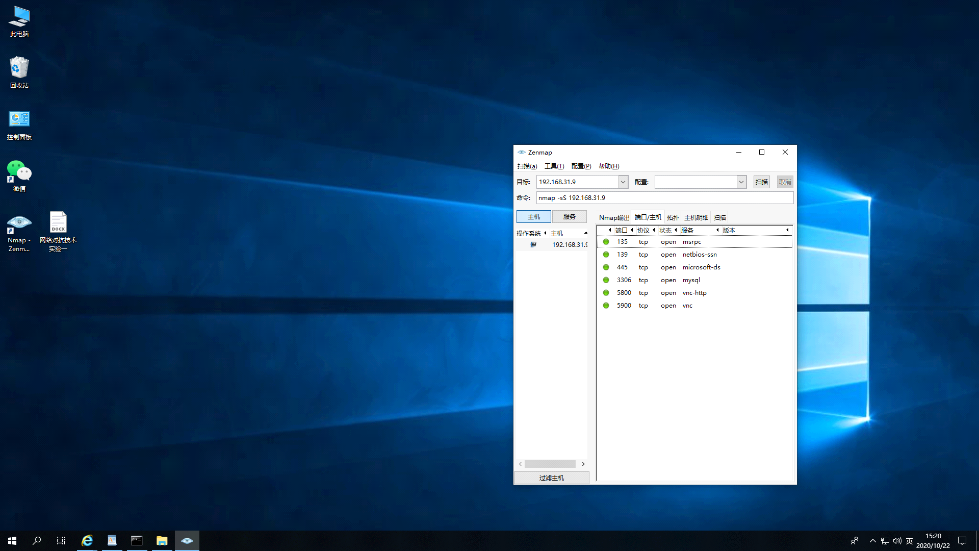 选择一个存活IP地址,扫描所开放的端口(分别用ping扫描,syn扫描尝试和全连接扫描),并查询常用端口所对应的服务及操作系统信息。