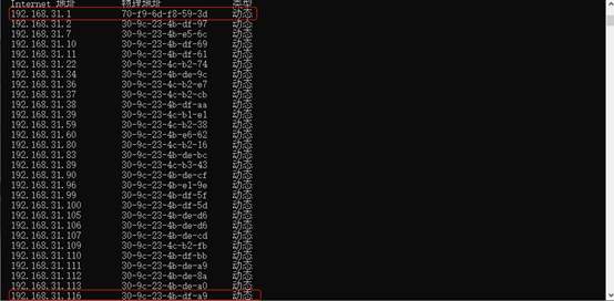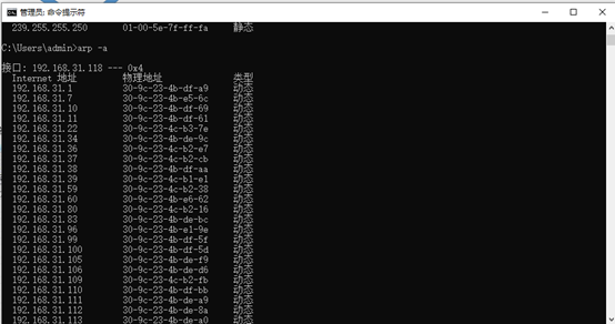 下图为欺骗开始后在192.168.31.118机器上用arp –a命令查询本机arp缓存表的情况,会发现缓存表中的网关对应的MAC地址变成了192.168.31.116号机(实施ARP欺骗的机器)的IP地址