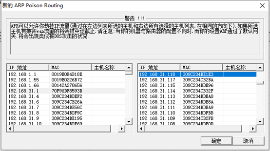 3、选中ARP页,点下列表栏空白处,点上方大加号,在弹出的窗口中选择要嗅探的目标主机。左面直接点网关,其它机器自动出现在右侧列表中,选中被欺骗的主机192.168.31.118。