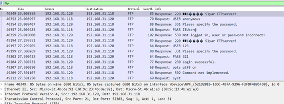 4.在ip地址为192.168.31.120的主机上建立ftp服务器(受害服务器),使用受害主机访问ftp服务器,使用wireshark在攻击者的主机上可以捕获到两个主机之间的ftp包。
