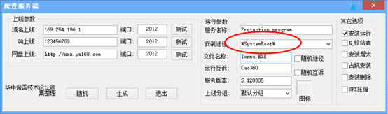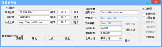 点击菜单栏中的“服务生成”,在弹出的配置服务端中,配置回连IP地址(攻击者IP)和端口号,并点击“生成”按钮,生成木马服务端。