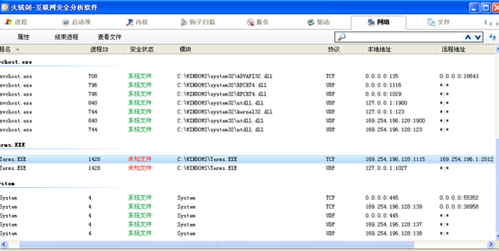 推断木马程序一定会使用网络,而且联网进程本身不多,故可以先从网络进程下手。