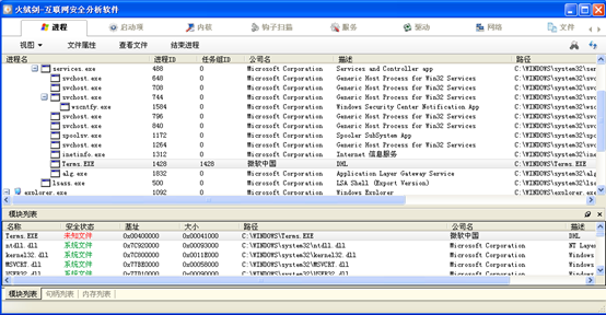 在系统进程下,我们很容易就发现名为Terms.exe的子进程,它是从属于名为System的系统进程下的。从而推断:该木马通过将自身进程整合到系统进程下,从而实现了开机自启动。