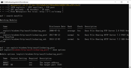 3.进入msf命令行后使用search命令查找相关模块,use 加载模块,show options 查看参数。