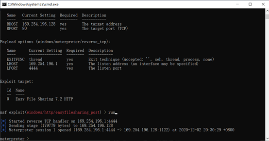 4.把远程目标参数rhosts设置为主机A的IP地址,开始攻击。