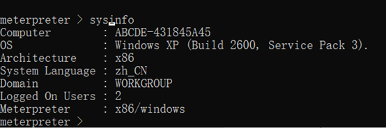 5.进入到meterpreter> 命令行下,说明已经获取到shell,可以使用sysinfo查看目标系统的信息,screenshot截屏。