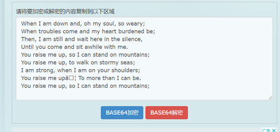 V2hlbiBJIGFtIGRvd24gYW5kLCBvaCBteSBzb3VsLCBzbyB3ZWFyeTsKV2hlbiB0cm91YmxlcyBjb21lIGFuZCBteSBoZWFydCBidXJkZW5lZCBiZTsKVGhlbiwgSSBhbSBzdGlsbCBhbmQgd2FpdCBoZXJlIGluIHRoZSBzaWxlbmNlLApVbnRpbCB5b3UgY29tZSBhbmQgc2l0IGF3aGlsZSB3aXRoIG1lLgpZb3UgcmFpc2UgbWUgdXAsIHNvIEkgY2FuIHN0YW5kIG9uIG1vdW50YWluczsKWW91IHJhaXNlIG1lIHVwLCB0byB3YWxrIG9uIHN0b3JteSBzZWFzOwpJIGFtIHN0cm9uZywgd2hlbiBJIGFtIG9uIHlvdXIgc2hvdWxkZXJzOwpZb3UgcmFpc2UgbWUgdXDigKYgVG8gbW9yZSB0aGFuIEkgY2FuIGJlLgpZb3UgcmFpc2UgbWUgdXAsIHNvIEkgY2FuIHN0YW5kIG9uIG1vdW50YWluczs=