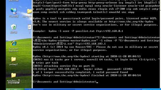 2.B同学使用hydra 对ftp用户的密码进行字典破解。hydra 中有关于该软件的使用命令语法。字典文件需要自己去生成。