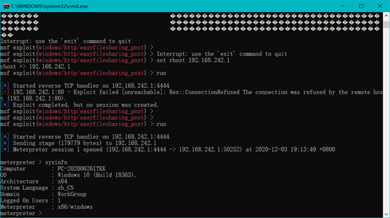 5.进入到meterpreter> 命令行下,说明已经获取到shell,可以使用sysinfo查看目标系统的信息,screenshot截屏。