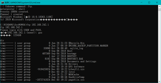 4.用被控机器的shell登录B机器的ftp,下载并执行木马。查看木马上线。