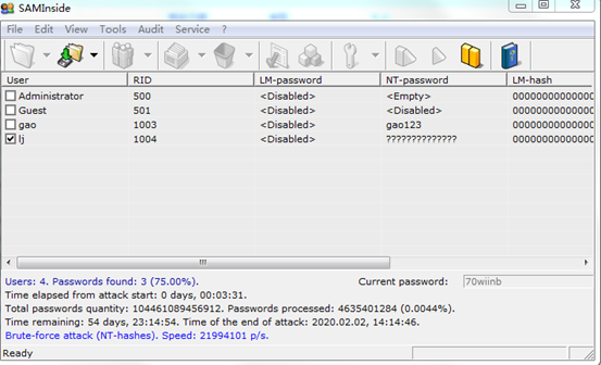 3.使用saminside软件将sam.txt导入,并进行破解,注意配置字典破解和暴力破解