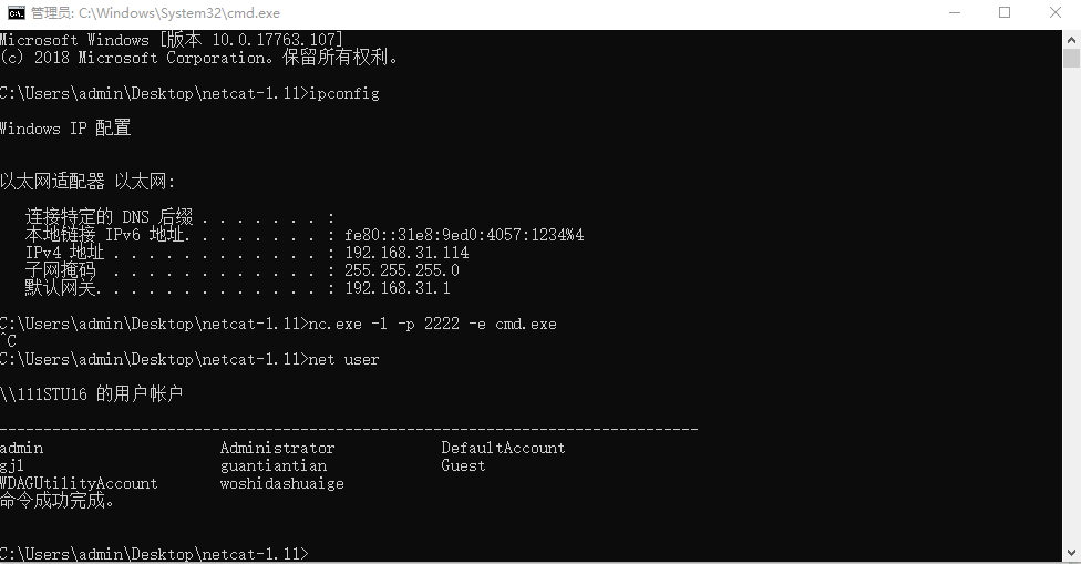 nc.exe -l -p port -e cmd.exe 进入监听模式
