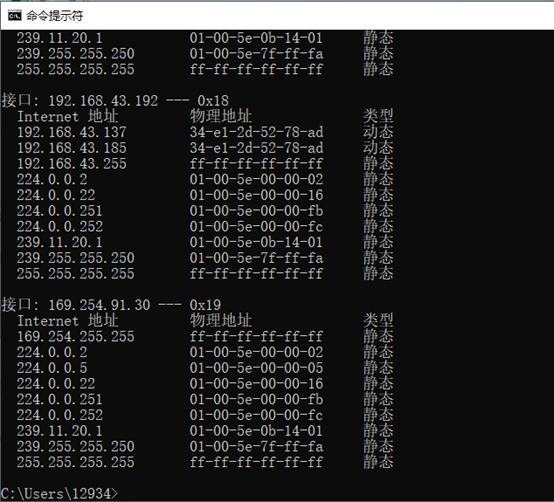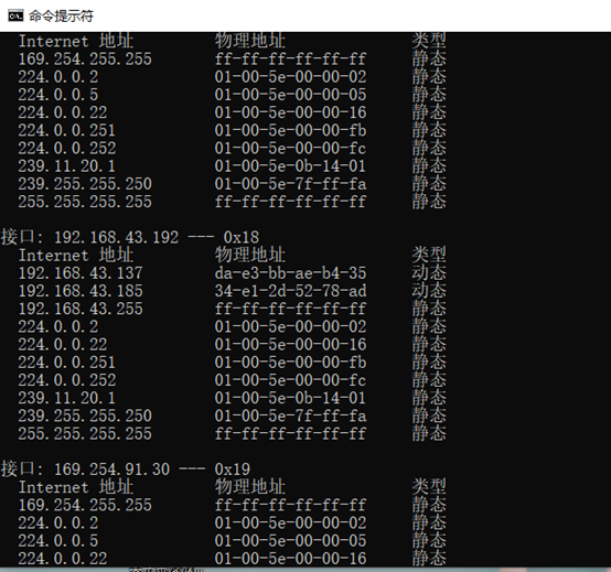 ARP欺骗前192.168.43.192机正常缓存表(实验中的IP可能和本IP不一样)