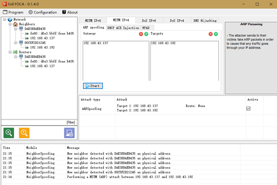 2、在192.168.43.185(实验中的IP可能和这个不一样)号机器上运行EVIL FOCA,选择要嗅探的网卡(单网卡,默认就可以)
