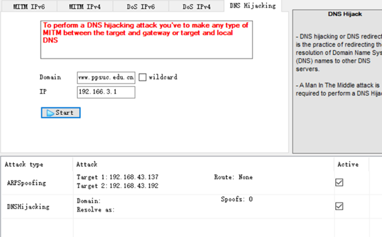 3.B同学扮演攻击者,设计攻击方法,使用CAIN,通过DNS欺骗的方式,让A同学访问www.ppsuc.edu.cn网址的时候,访问到另外一台机器上的伪造网站