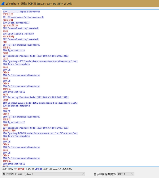 4.B同学停止Wireshark抓包,并和A同学一起分析数据包中的FTP登录过程,还原登录用户名和密码,以及上传文件。