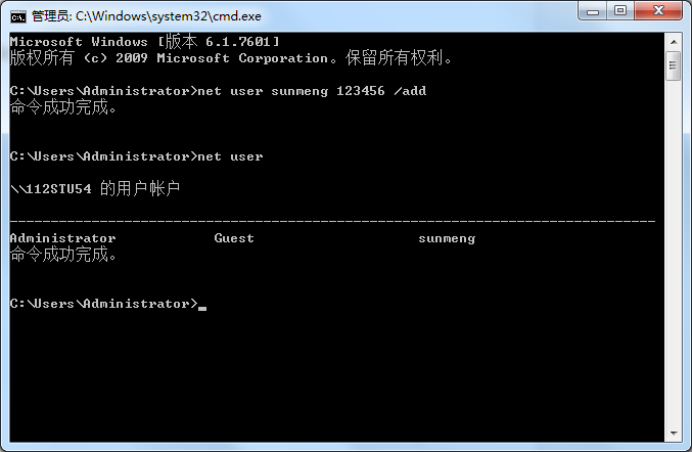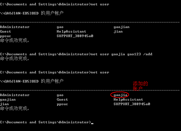 1.在windows xp系统中使用 net user gao gao123 /add添加用户gao,密码gao123的账户(用户名和密码可以自己设定);并使用net user命令确定用户添加成功。