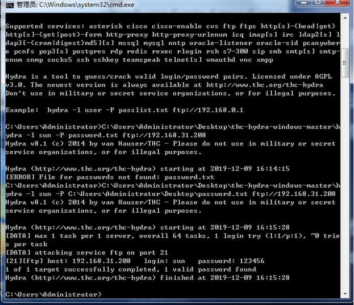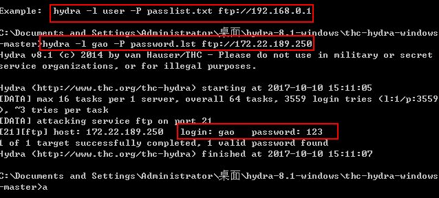 B同学使用hydra 对ftp用户的密码进行字典破解。hydra 中有关于该软件的使用命令语法。字典文件需要自己去生成。