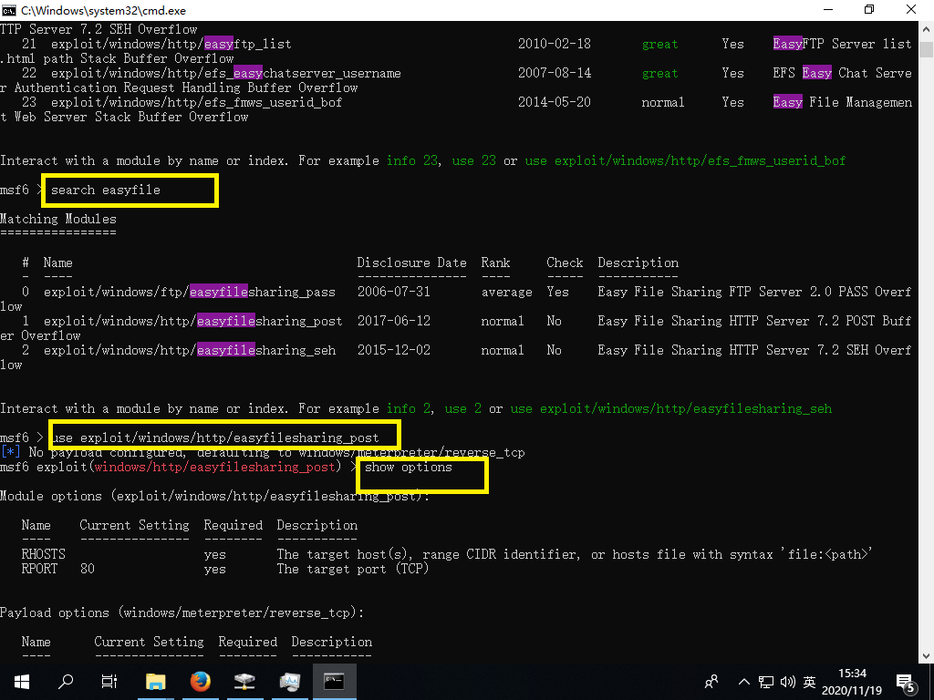 3.进入msf命令行后使用search命令查找相关模块,use 加载模块,show options 查看参数。