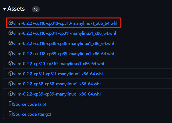 但是还没有结束,因为vllm这个库很特殊,它只能与12.1或者11.8的cuda兼容,12.1的cuda直接下最新版的vllm就行,11.8的cuda请下载下面链接的vllm,我下的第一行的,可以根据自己的python版本自己选。
