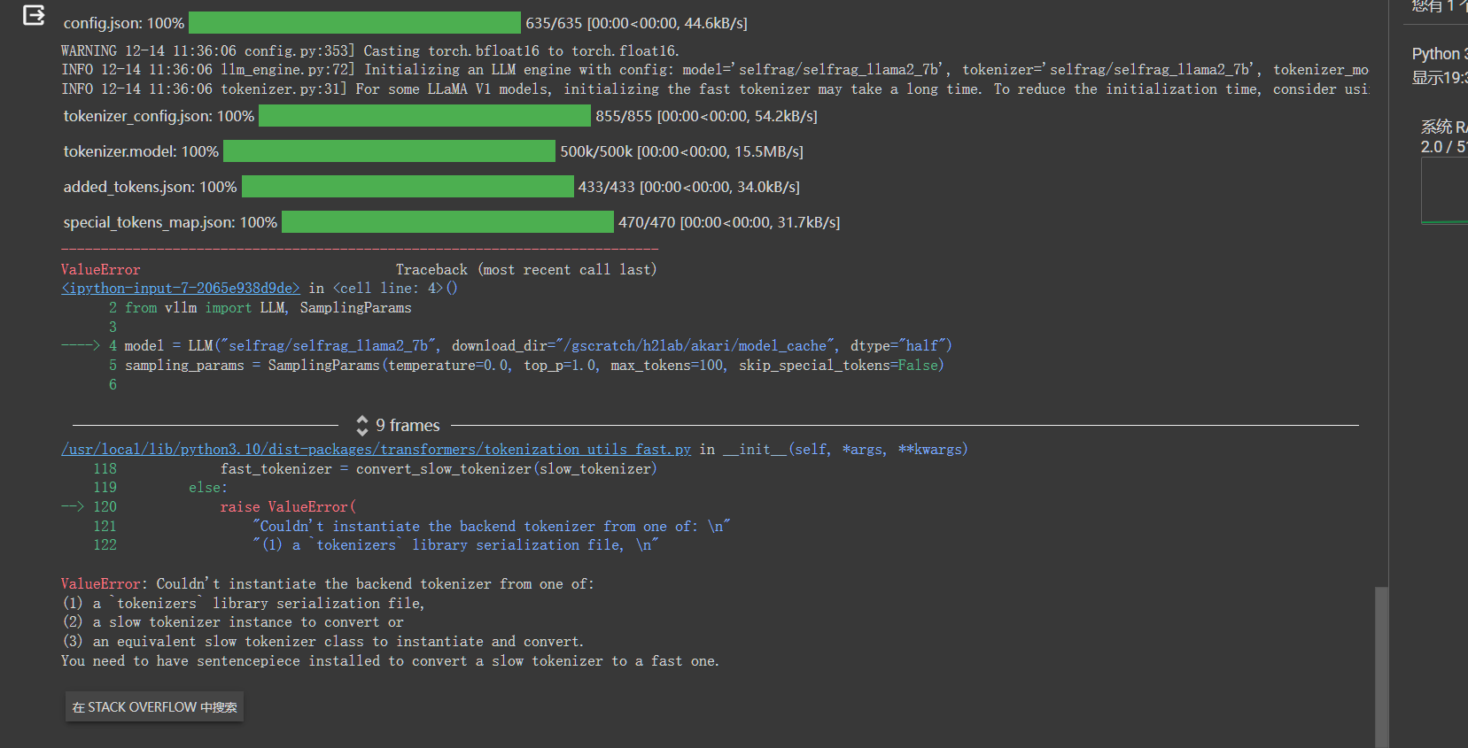 需要注意的是,这个代码会从hugging face网站上下载llama2模型,所以需要go out,如果搭了还是报错,显示无法连接到hugging face网站,那就先把这个模型的所有文件下载到本地(大概12个G),然后改一下上面代码中的这一行: