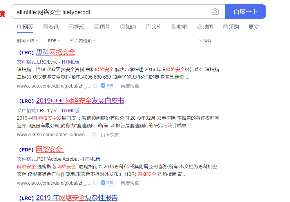 2、用百度搜索所有包含“网络安全”的pdf文档(附截图)
