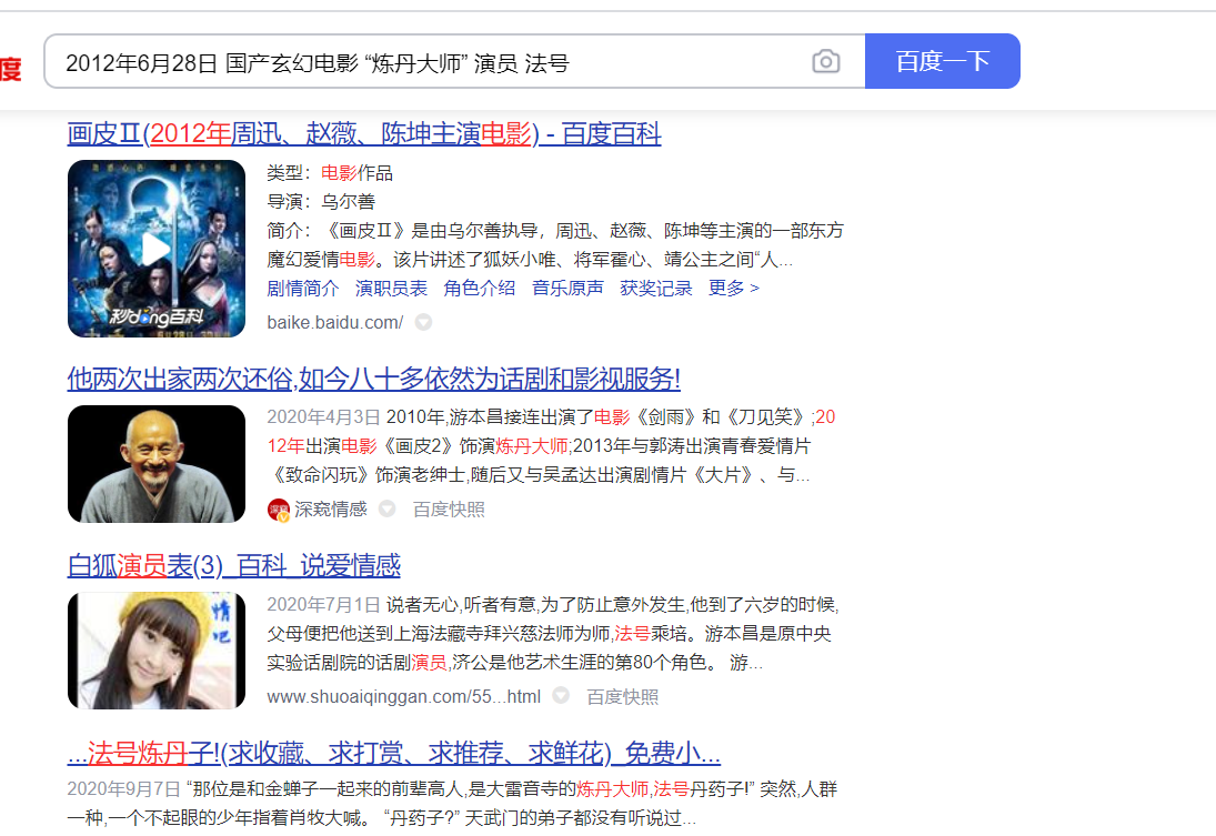 4、6月28日是小王的生日,他是中国人民公安大学2008年入学的本科生。在大四这年,为了庆祝生日,他和朋友们一起看了一场刚好在生日这天上映的国产玄幻电影。在这场电影中,饰演“炼丹大师”角色的演员曾经出家,请问他当时的法号是什么?(附截图)