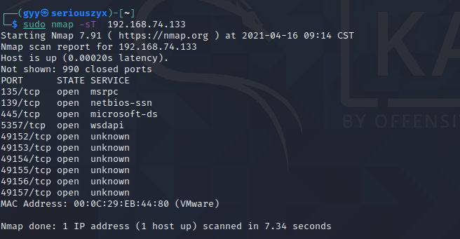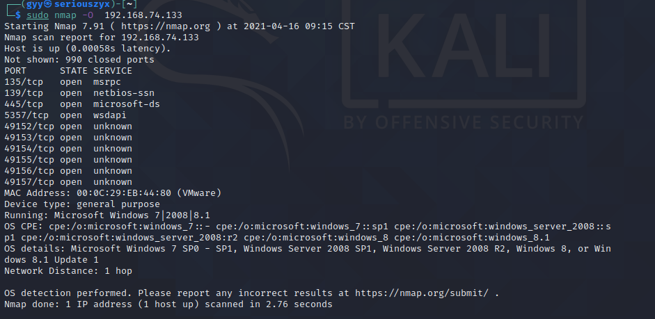 9、选择一个存活IP地址,扫描所开放的端口,并查询常用端口所对应的服务及操作系统信息(附搜索截图