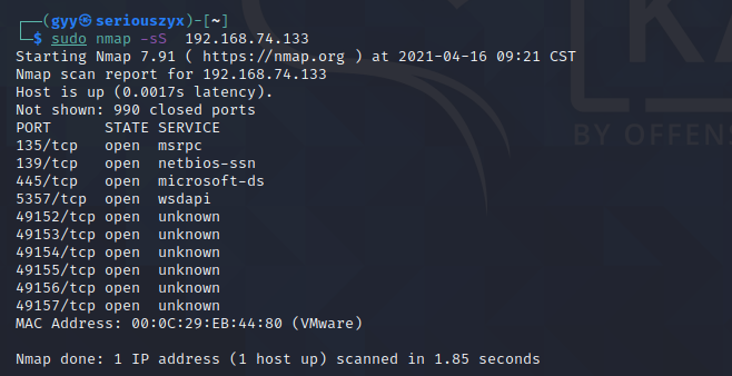 10、选择一个存活IP地址,使用半连接扫描其开放端口,并通过抓包软件分析其数据包特点【附截图】