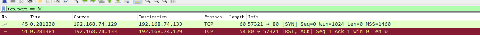 如图所示:以80端口为例,nmap发送一个SYN报文到目标IP,目标IP响应一个SYN/ACK报文,然后nmap就不回复了。