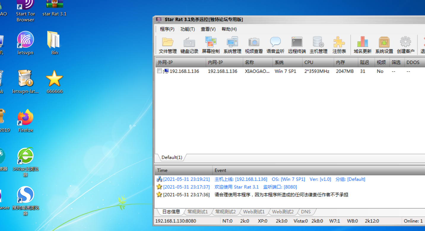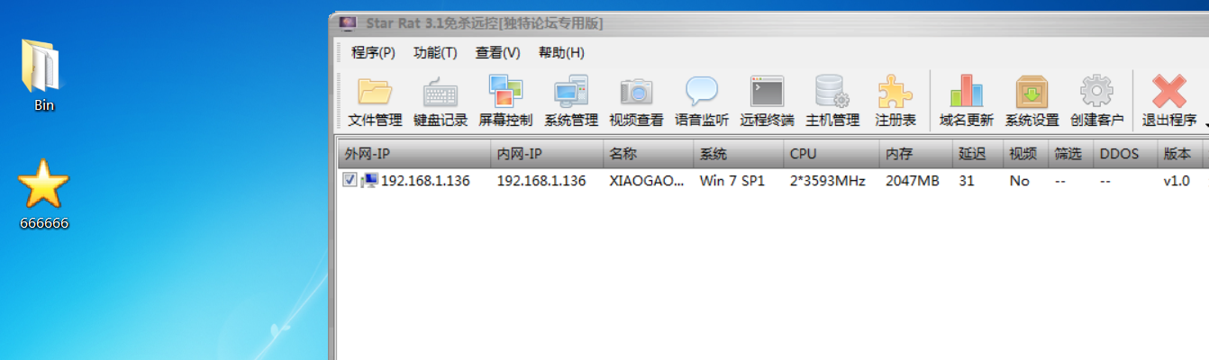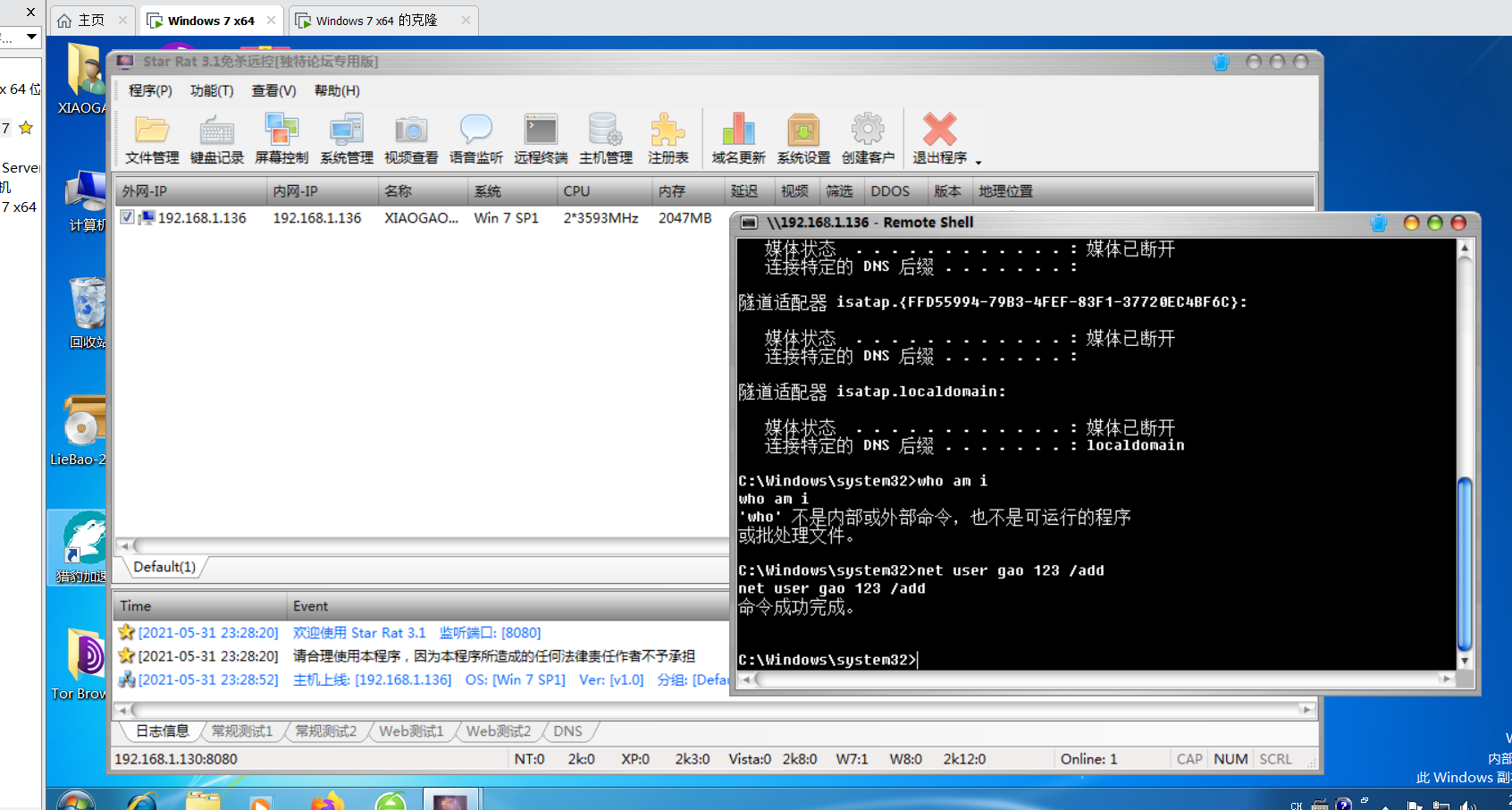 由于本次实验所用虚拟机是两台win7旗舰版,所以屏幕监听无法实现。用高版本windows系统操控低版本可以实现此功能。