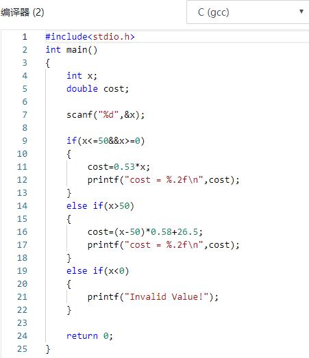 - 数据处理:采用了if-else语句,它属于分支结构,其表达式为cost=(x-50)0.58+500.53和cost=x*0.53。