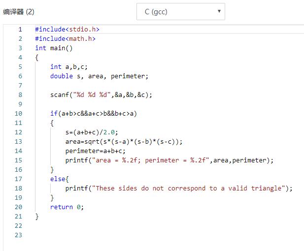 1.2本题要求编写程序,根据输入的三角形的三条边a、b、c,计算并输出面积和周长。注意:在一个三角形中, 任意两边之和大于第三边。三角形面积计算公式:area=(s(s−a)(s−b)*(s−c)),其中s=(a+b+c)/2。##