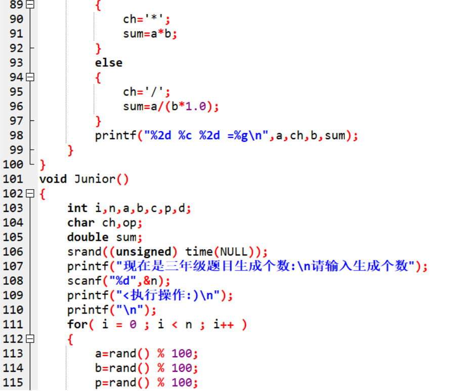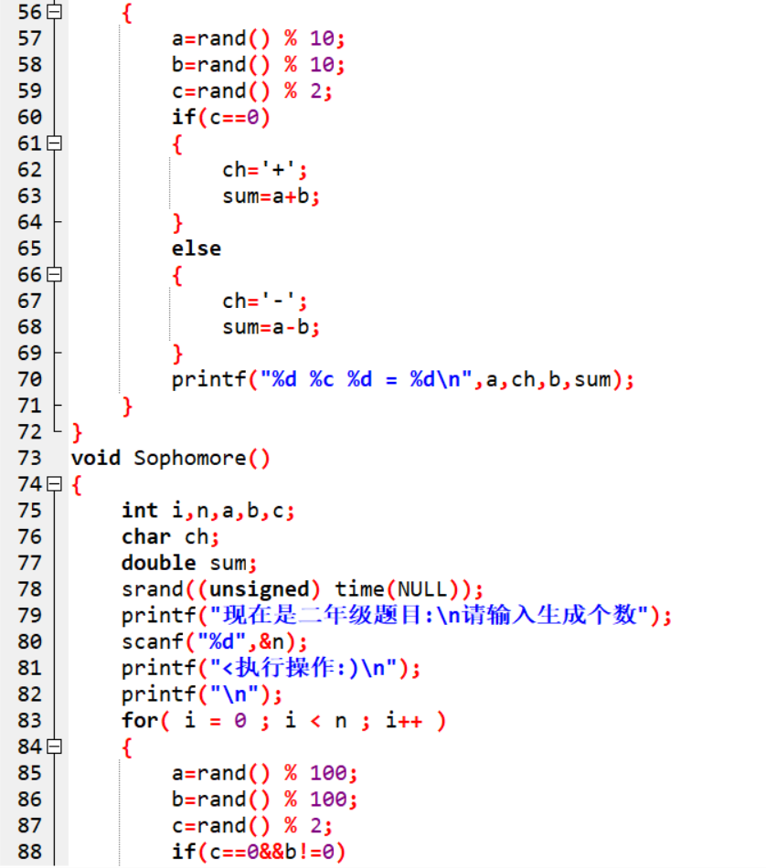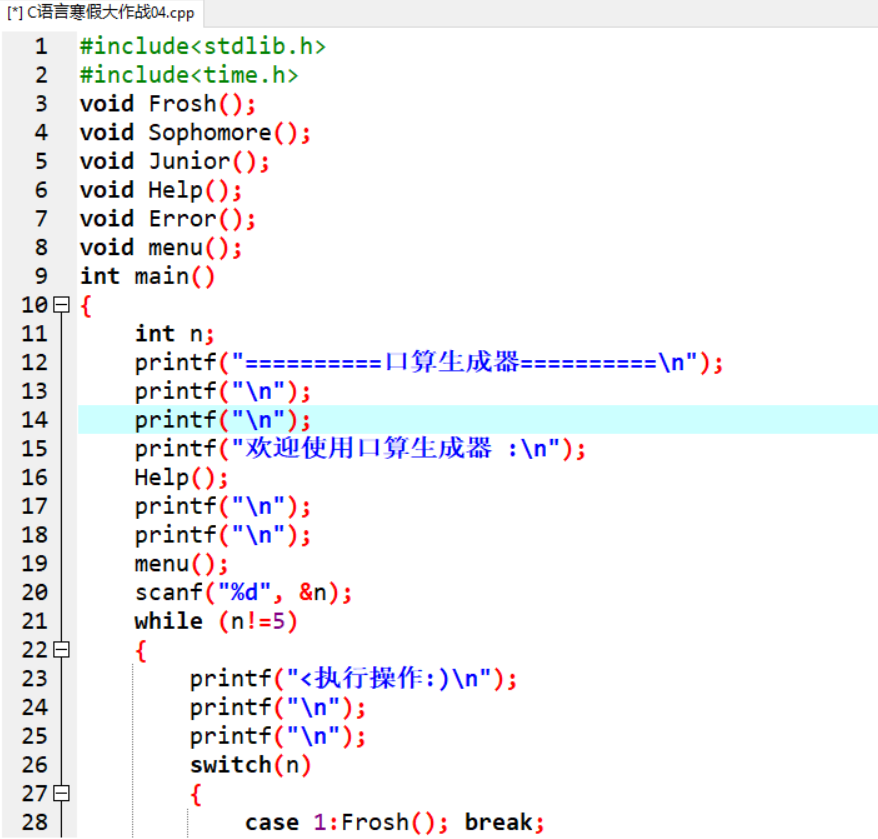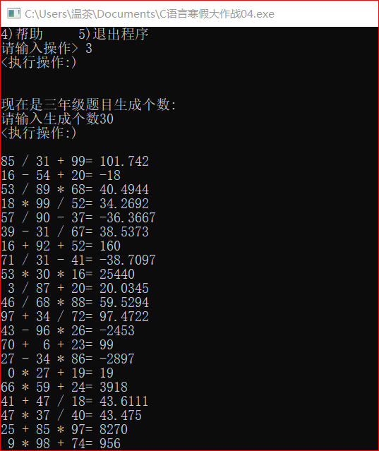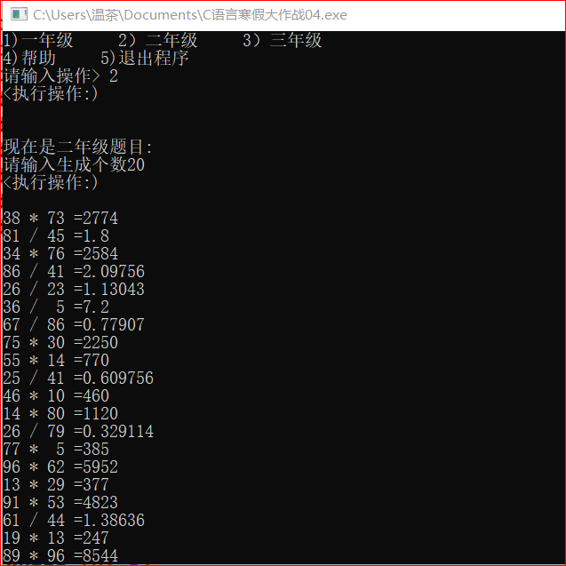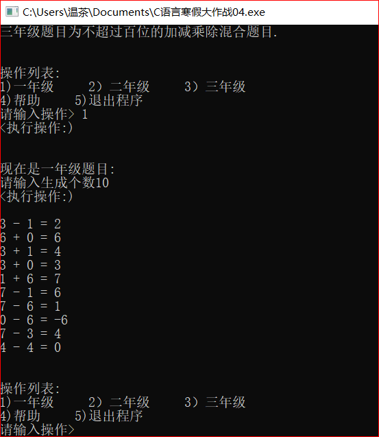 | 作业正文 | 使用switch编写菜单程序,使用rand函数来产生随机数,并算出生成口算题的结果 |