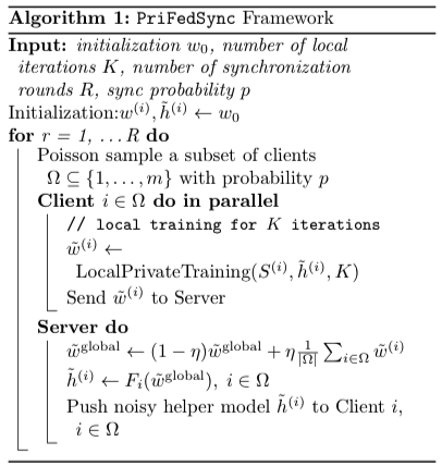 我们提出了一个统一的框架PriFedSync,该框架解决了异构和同质设置,请参见算法1。每个客户我将获得一个特定的本地模型〜w (i),并且仍然形成并使用全局模型〜w全局。同质设置可以归结为一种特殊情况,其中〜w (i) = 〜w全局, [m] (我们使用 [m] 表示 {1,。,m})。PriFedSync包含大量现有的联合学习算法,包括FedAvg (McMahan等人,2017) 和许多其他算法 (Li等人,2018; Dinh等人,2020; Huang等人,2020; Hanzely和Richt'arik,2020; Deng等人,2020)。