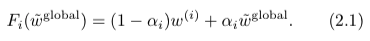 接下来,客户端i将私有模型〜w (i) 发送到服务器。服务器聚合接收到的模型,然后更新相应的帮助器模型。有很多方法可以计算辅助模型。如果F i函数是身份映射F i (w) = w,i 2 [m],则所有客户端将收到相同的辅助模型〜w全局。这是在FedAvg中使用的设置 (McMahan等人,2017)。另一个简单但有效的观察是,〜h (i) 是噪声全局模型w全局模型和局部模型w (i) 的凸组合 (Dinh等人,2020; Hanzely和Richt'arik,2020):