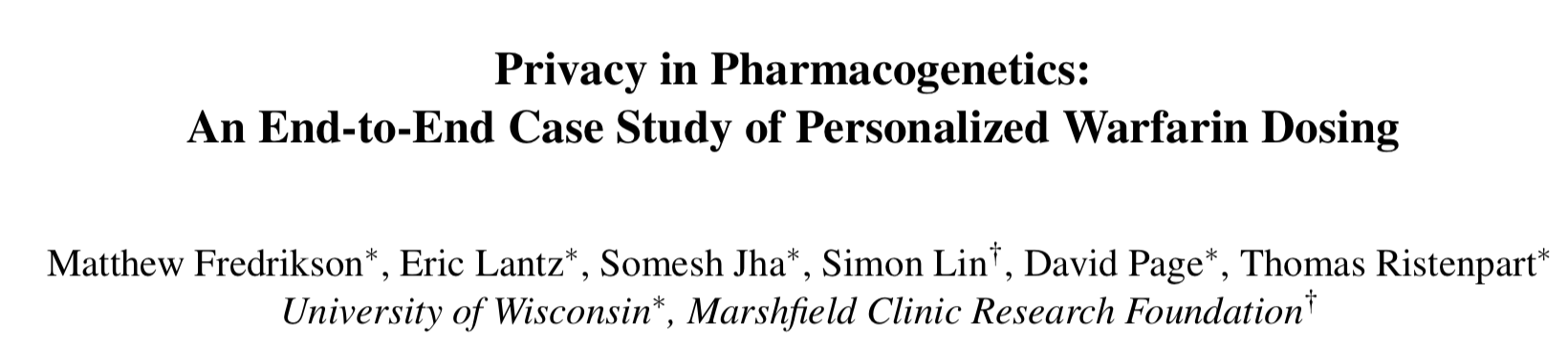 我们发起了药物遗传学中的隐私研究,其中机器学习模型被用来根据患者的基因型和背景指导医疗。对个性化华法林剂量中的隐私进行了深入的案例研究,我们发现建议的模型存在隐私风险,特别是因为攻击者可以执行我们所说的模型反转:攻击者在给定模型和一些关于患者的人口统计信息后,可以预测患者的基因标记。