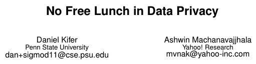 首先,我们使用一个没有免费午餐定理来论证,如果不对数据是如何生成的做出假设,就不可能提供隐私和效用。然后我们解释哪里需要假设。我们认为,当可以限制攻击者对个人参与数据生成过程的推断时,个人的隐私就会得到保护。这与限制关于元组的存在的推断不同(例如,鲍勃在社交网络中的参与可能导致在他的朋友对之间形成边缘,从而其ff不仅影响被标记为“鲍勃”的元组)。(ff)反过来,参与证据的Definition取决于数据是如何产生的--这就是假设进入画面的方式。我们使用来自社会网络研究的例子以及先前发布的确定性统计数据的表格数据来解释这些想法。在这两种情况下,参与的概念各不相同,使用不同的隐私可能导致侵犯隐私,并且不同的隐私并不总是充分限制关于参与的推论。