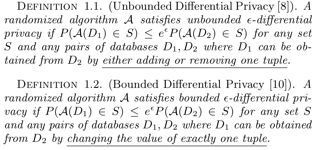 有界差分隐私因以下事实而得名:所有数据集D1、D2都具有固定大小n,而无界差分隐私没有这样的限制