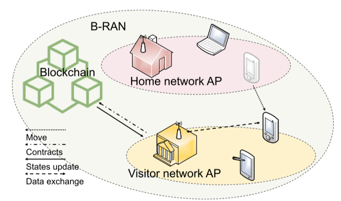 图2。B-RAN中跨网络漫游的图示。区块链可以为访问多个网络的订户实现漫游数据交换,并在最初不受信任的各方之间建立RAN。