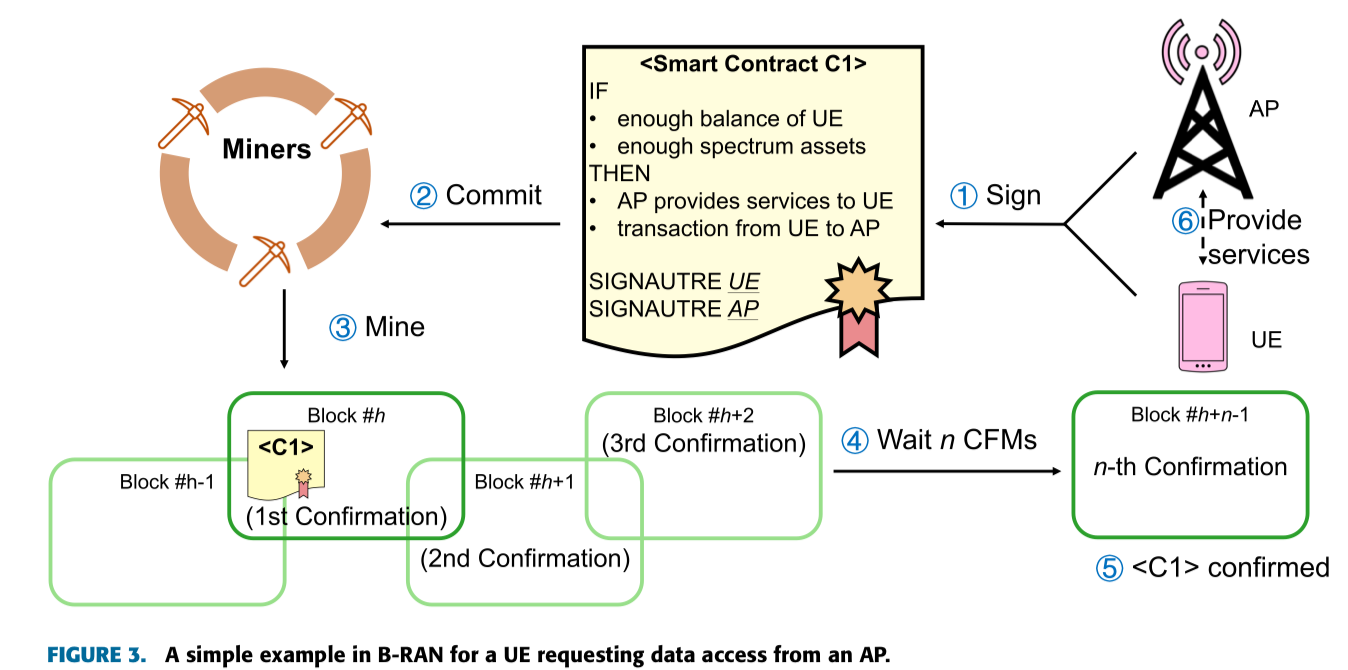 由客户的数字签名授权的合同(图3中的步骤1)。智能合同承诺(步骤2)给采矿网络,并由矿工验证,以确定UE是否有足够的信用余额支付AP,AP是否有足够的可用频谱资产。如果满足合同条件(例如,足够的余额和频谱资产),则将验证的合同聚合以创建新区块,然后将其添加到现有区块链(步骤3)。在其上构建多个验证块(步骤4)后,新的挂起块将被接受到主链中(步骤5)。UE将被授予对频谱资产的有时间限制的访问权,并且AP将自动从UE接收访问费(步骤6)。B-RAN中的区块链可以组织一个大型合作网络并保护参与者的利益。UE的利益和AP的权利由智能合约强制执行,从而在最初不受信任的AP和UE之间建立信任。