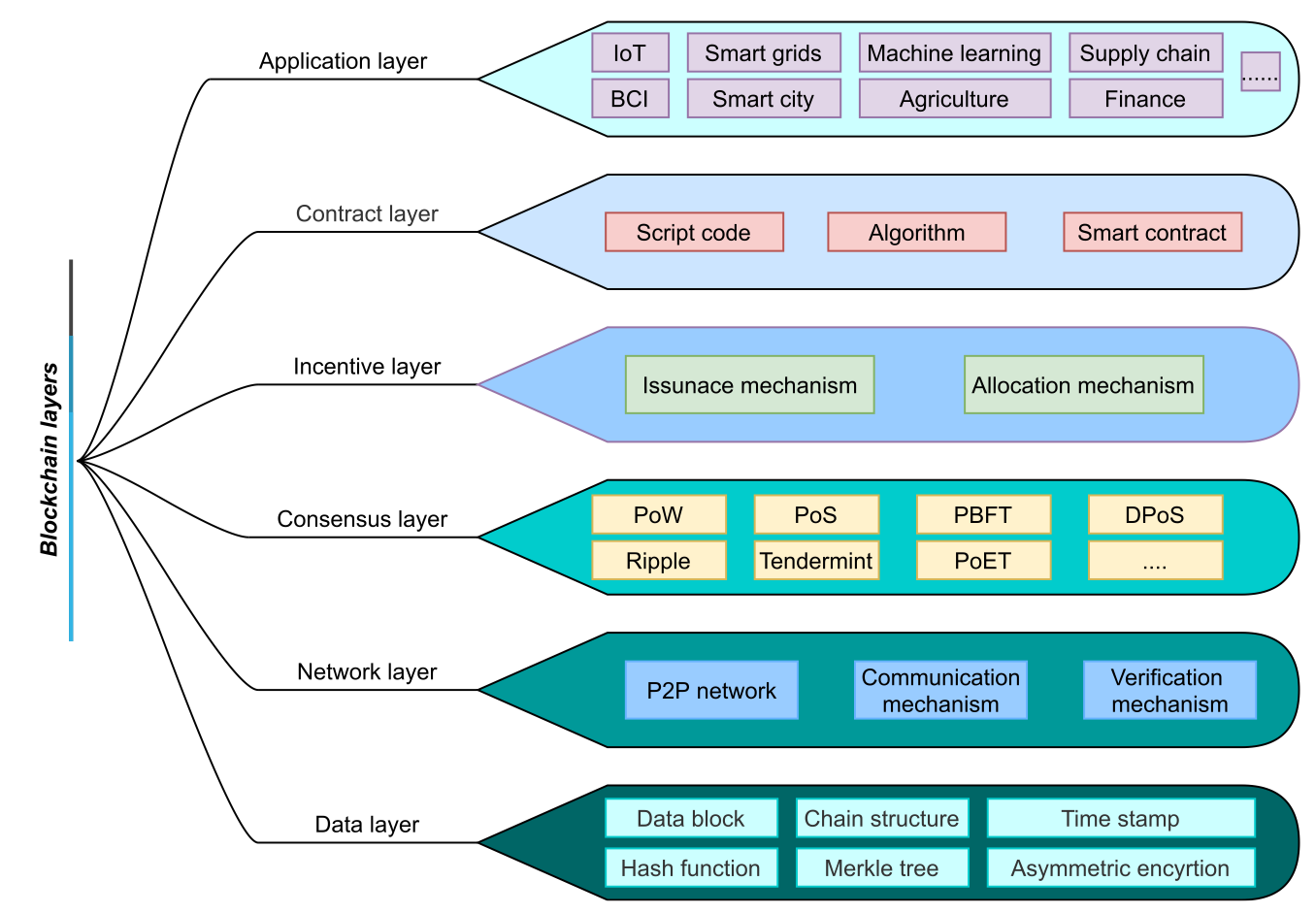 各种区块链应用程序,如加密货币钱包,都可以在应用程序级别找到。在合同层或执行层,我们拥有决定交易性质的智能合同环境。网络的安全性取决于节点的参与。激励层提供激励,以激励节点参与区块链的验证过程。通常,区块链会向参与者提供一定数量的虚拟货币作为奖励。例如,比特币提供一些比特币作为奖励。在一致性层,我们有一个一致性机制,确保网络中参与节点之间的一致性。用于事务安全传播的网络层策略。数据层提供了一种数据结构,用于存储数据和对数据存储执行各种操作。